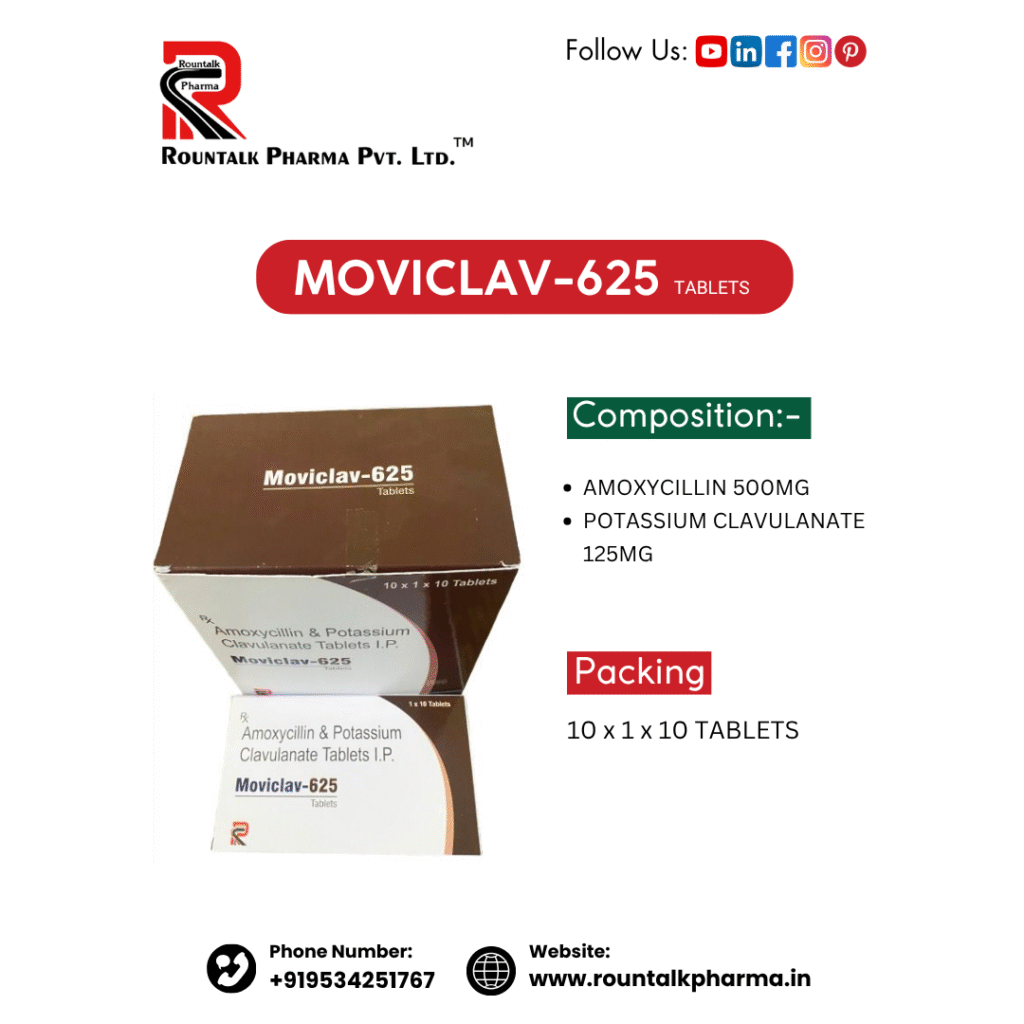 Moviclav-625 Tablets is a combination of Amoxycillin and Clavulanic Acid, a powerful broad-spectrum antibiotic formulation used to treat a wide variety of bacterial infections. It works by stopping the growth of bacteria and preventing them from developing resistance.
